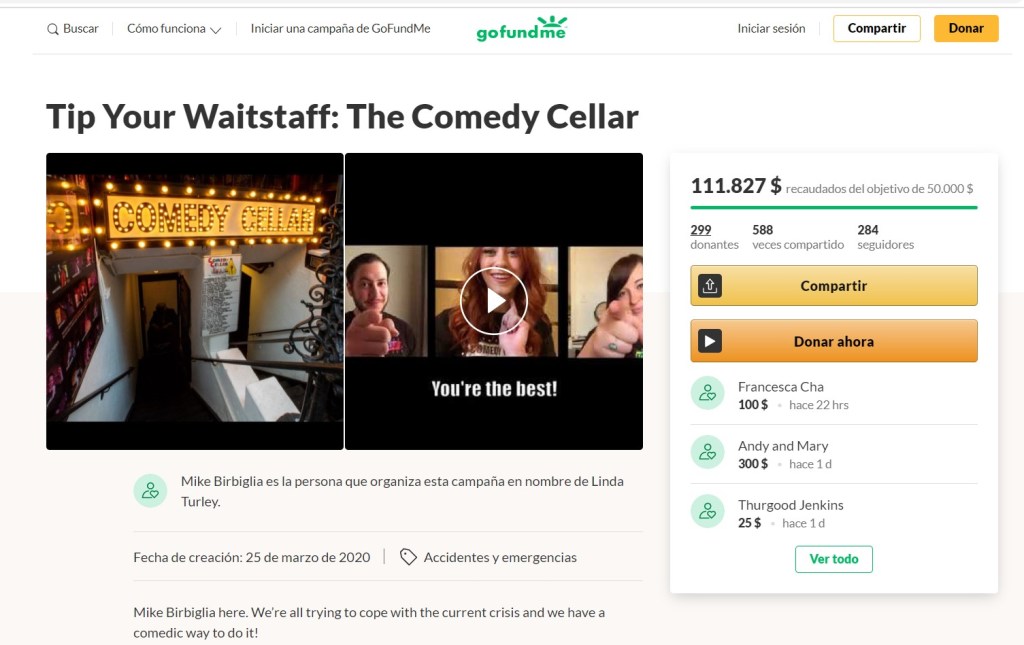 Ante la crisis desatada por la pandemia del nuevo coronavirus y la prohibición de la gente a salir a la calle y reunirse en lugares públicos que ya lleva hasta el momento 41 días, muchos administradores de restaurantes siguieron el camino elegido por Birbiglia para salvar el negocio. En la misma plataforma de GoFoundMe hay miles de esas colectas a lo ancho de todo el país. En el área de Nueva York, lo han hecho Le Bernardin & Aldo Sohm Wine Bar, Del Pesto, el Olmstead & Maison Yaki Matter House, el Raoul’s; incluso hoteles como el Bowery han apelado a la empatía y generosidad de sus clientes para sobrevivir. En el área de Brooklyn, lugares como el Barbes, que tiene 18 años programando música en vivo 364 días del año o el lesbian-bar Ginger, han hecho colectas para reunir 25 mil y cinco mil dólares, respectivamente para los gastos de operación derivados de sueldos y cuentas por pagar.