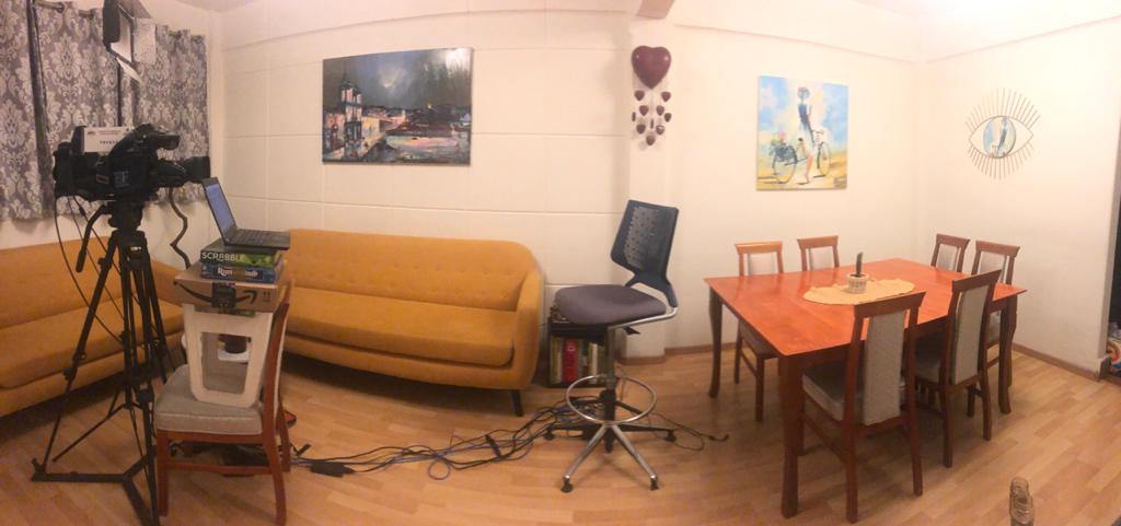 El 19 de marzo fue mi primera transmisión desde casa. A partir de entonces, el lugar que ocupaba una mesa de centro hoy le pertenece a un tripié, una lámpara y una cámara. El comedor se convirtió en escritorio y quedó arrinconado para cederle lugar a un banco, mientras que sobre el suelo por el que solíamos caminar se entretejen largas marañas de cables. Del prompter improvisado les hablaré más adelante.