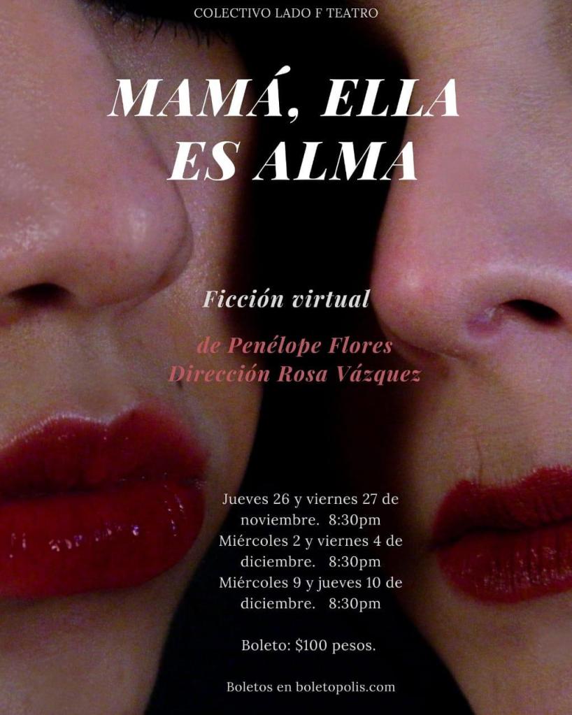 Asimismo, está en cartelera una obra planteada desde la dramaturgia para el formato de Zoom que utiliza con gran ingenio los recursos que plantea dicha plataforma. Se trata de Mamá, ella es Alma, de Penelope Flores y dirección de Rosa Vázquez, con las estupendas actuaciones de Francisca Vargas y Deia Vargas, entre otras. La obra transcurre en una cena de Navidad Covid-19 en la cual una madre, sus dos hijas y una invitada se reúnen vía Zoom para festejar esta significativa fecha. También se presenta en línea la obra El museo de los sin recuerdos en la cual Juan Carlos Vives se desdobla en múltiples personajes que dialogan entre sí, gracias a recursos digitales.
