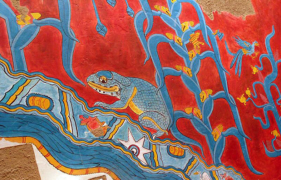 Imagen: Mazorca humanizada con sapo encima de una banda acuática sobre una serpiente emplumada. Mural oriente del Templo Rojo. Zona arqueológica de Cacaxtla (El lugar donde muere la lluvia en la tierra), Tlaxcala. Fotografía de Virgilio Cuautle Roldán.