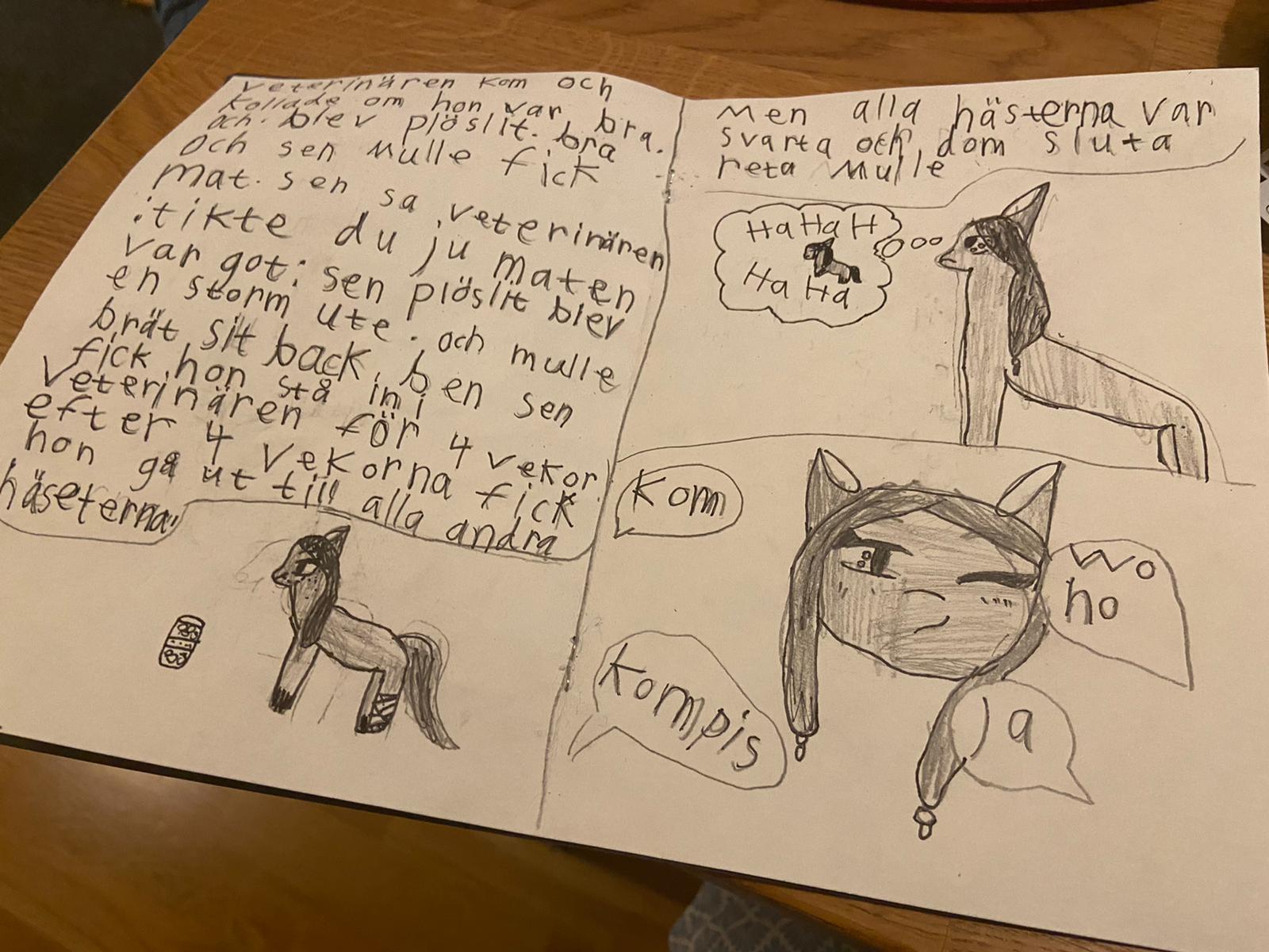 El veterinario vino y la examinó para ver si estaba bien, de repente se sintió bien y luego Mulle comió su comida. Después el veterinario le preguntó si creía que su comida estaba rica. De repente empezó una tormenta afuera y Mulle se quebró una pata de atrás, se tuvo que quedar en la veterinaria por cuatro semanas y después ella pudo salir y encontrarse con los otros caballos. Pero todos los caballos eran negros y ellos no la acosaban ni se burlaban de ella.