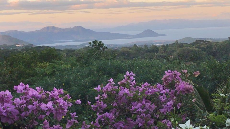 viene el atardecer sobre el perfil puntiagudo del volcán a lo lejos