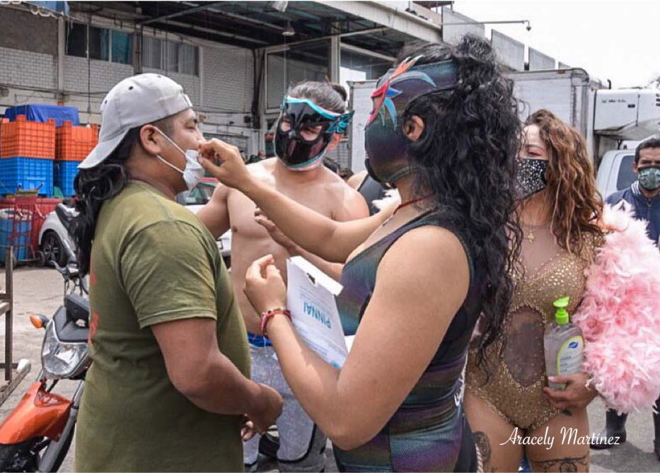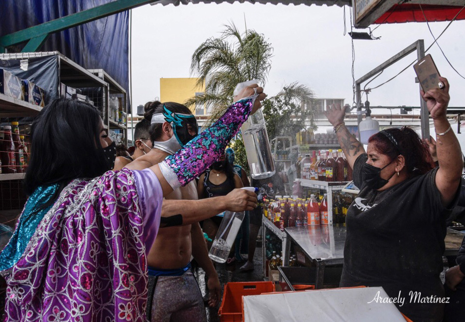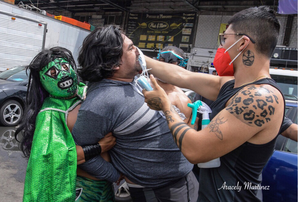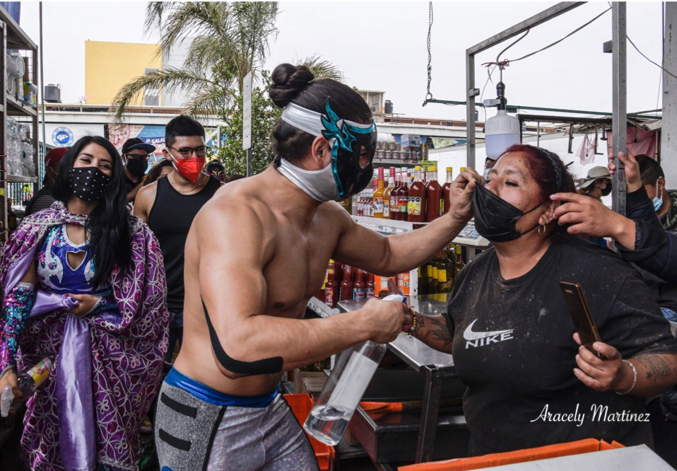 En su visita a la Central de Abastos de productos del mar en La Viga, las y los profesionales de la lucha libre brindan información, usan una forma creativa y diversas técnicas de su deporte para concientizar sobre las acciones que pueden salvar la vida.