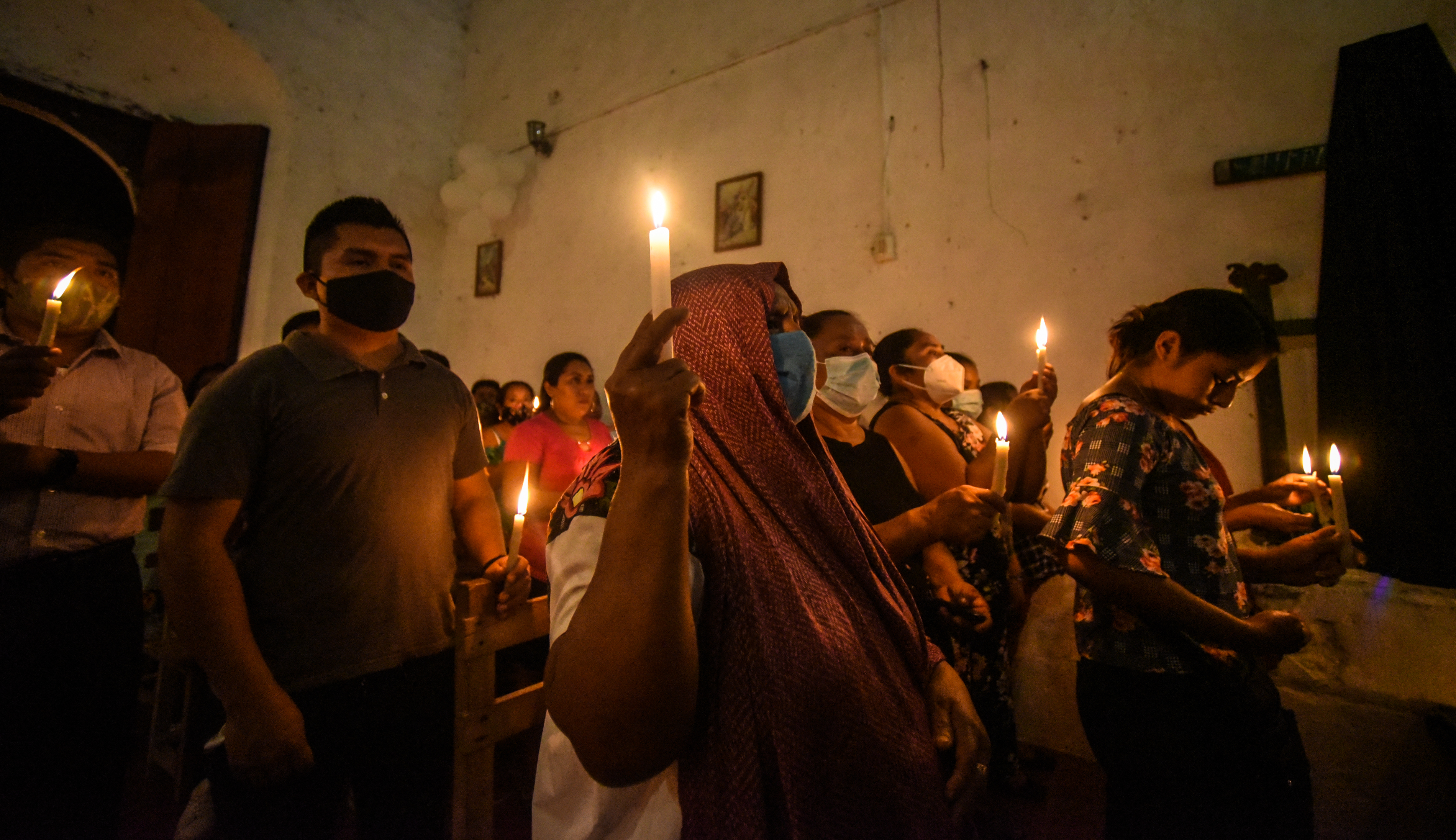 Finalmente, el cura Germán May Cabrera llega a la iglesia e invita a orar al pie de la fogata para posteriormente acercarse y prender el cirio que ya está listo. El cura inicia entonces su trayectoria hacia la entrada de la iglesia en donde la gente ya lo está esperando. A su paso se le acercan para ir prendiendo sus velas y compartir el fuego a su alrededor; ese fuego de renovación de la fe y su espíritu, un Fuego Nuevo que nace en sus corazones y su mente.