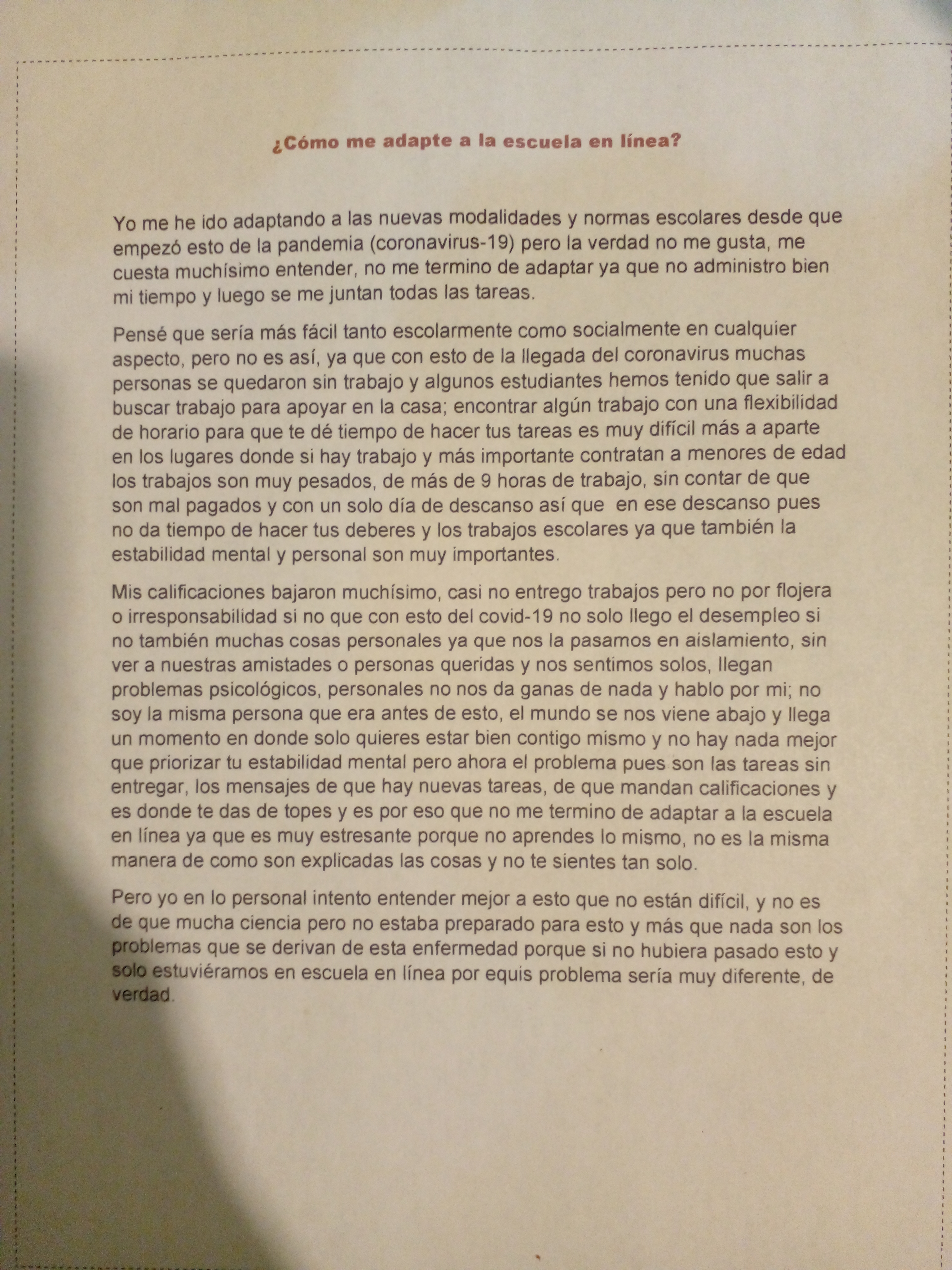 Pensé que sería más fácil tanto escolarmente como socialmente en cualquier aspecto, pero no es así, ya que con esto de la llegada del coronavirus muchas personas se quedaron sin trabajo y algunos estudiantes hemos tenido que salir a buscar trabajo para apoyar en la casa; encontrar un trabajo con una flexibilidad de horario para que te dé tiempo de hacer tus tareas es muy difícil, más aparte los lugares donde sí hay trabajo y más importante contratan a menores de edad. Los trabajos son muy pesados, de más de 9 horas de trabajo, sin contar de que son mal pagados y con un solo día de descanso. Así que en ese caso pues no da tiempo de hacer tus deberes y los trabajos escolares, ya que también la estabilidad mental y personal son muy importantes.