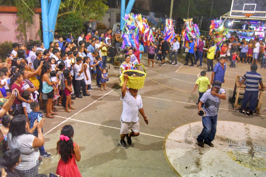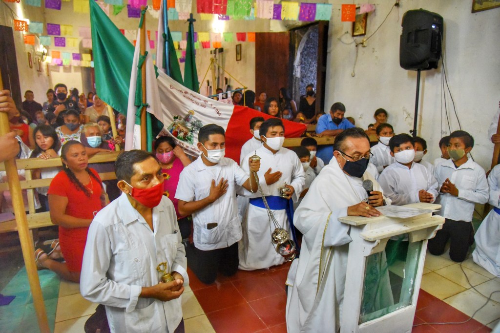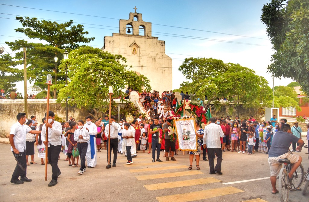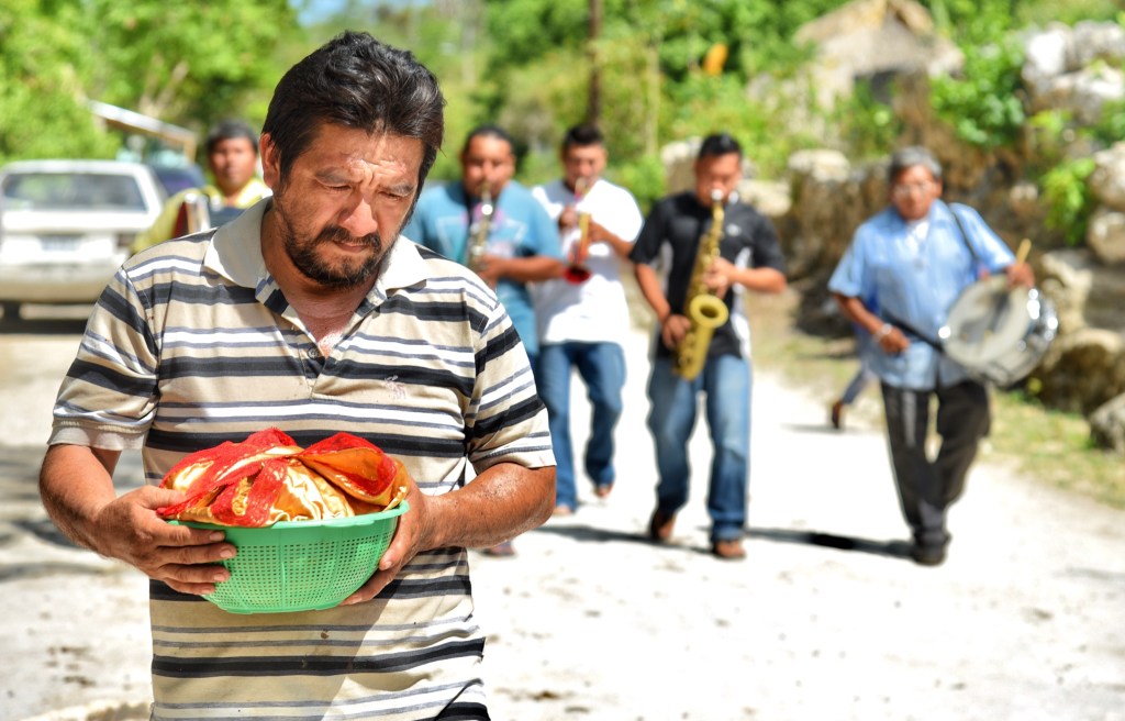Elmer Armando Uh Uh, acompañado de la banda, lleva una paila de comida a la iglesia que reparte entre la comunidad, después de que todos juntos rezan una novena. La convivencia continúa en casa de la familia Uh Tec, donde llegan los invitados del poblado, creyentes, familia y amigos para compartirla como parte de la tradición.