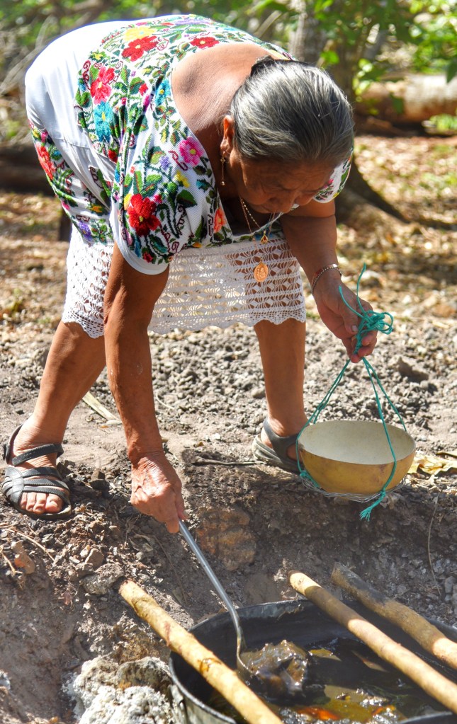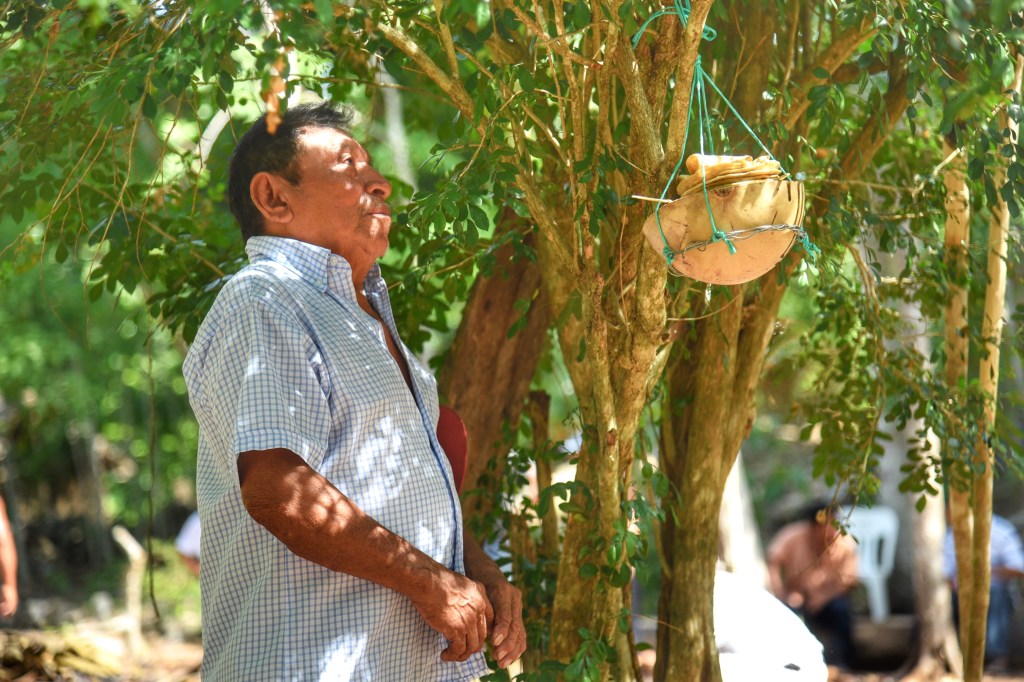 La señora Anastasia Uh Tamayo sirve el primer plato de comida lo prepara con cuidado y en orden, luego lo entrega a su esposo el señor Pablo Uh Uc, quien en un rincón del terreno cuelga la comida como una ofrenda de agradecimiento por los alimentos que provee la tierra y la naturaleza.