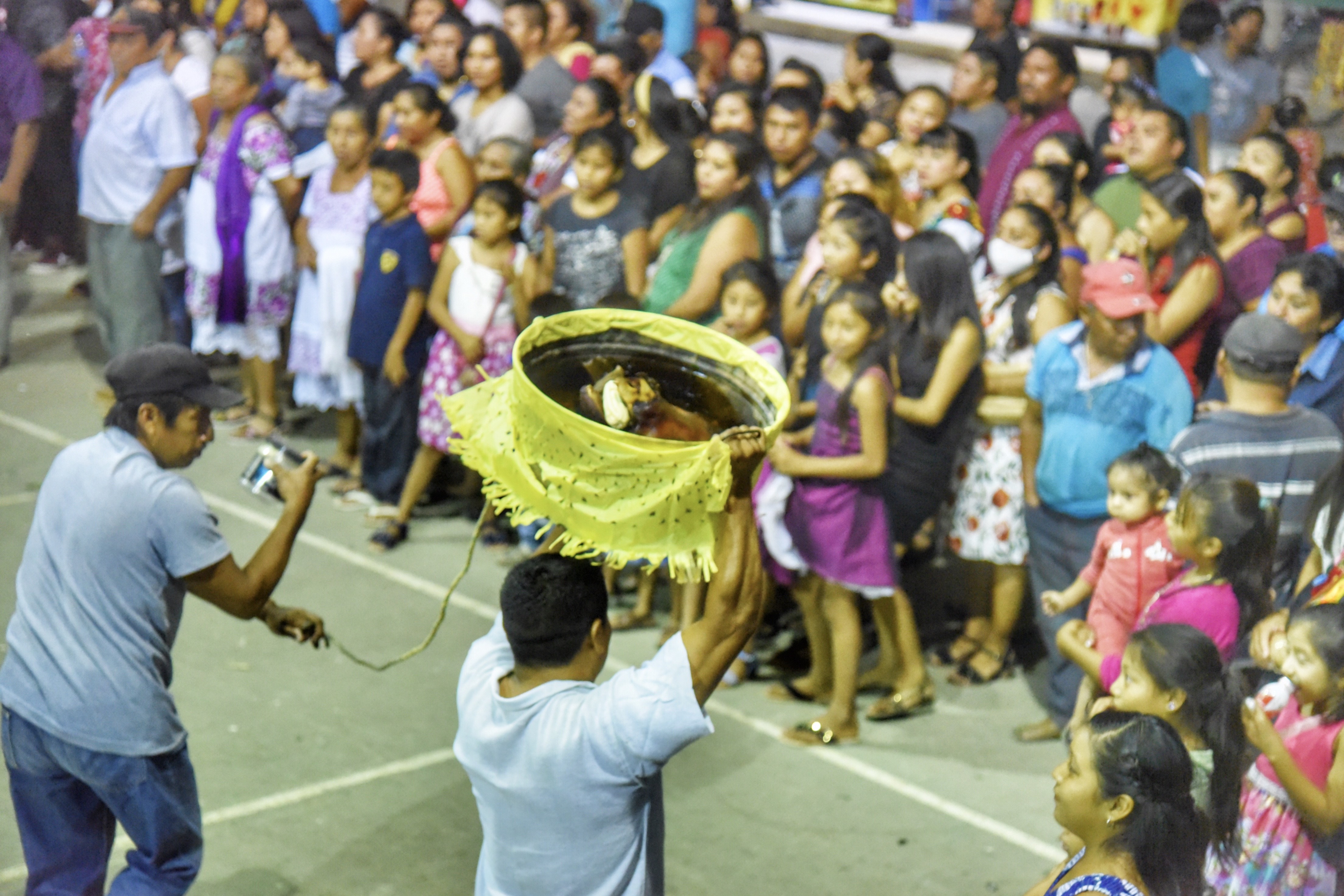 Elmer Armando Uh Uh, acompañado de la banda, lleva una paila de comida a la iglesia que reparte entre la comunidad, después de que todos juntos rezan una novena. La convivencia continúa en casa de la familia Uh Tec, donde llegan los invitados del poblado, creyentes, familia y amigos para compartirla como parte de la tradición.