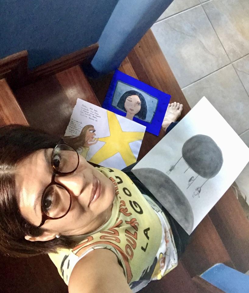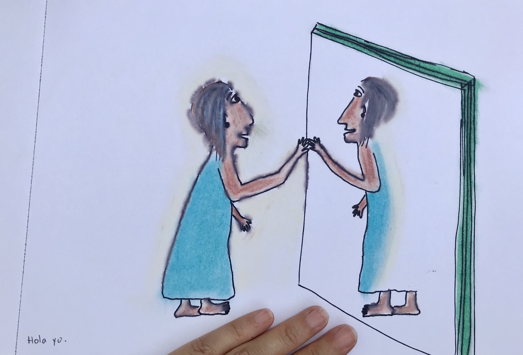 • 3. Yo en el espejo… Es extraño que no me represento usando anteojos, quizá sea porque no domino la técnica del dibujo o porque aunque los uso desde los 39 -la presbicia me dio anticipada-, no los he incorporado en mi mapa mental. De cualquier forma, acá estoy yo en frente al espejo en el ejercicio de reconocerme de nuevo, y veo mis mejillas caídas, veo decenas de nuevos lunares en la cara y en todo el cuerpo, me pongo de lado, del otro lado, de espalda, me visto y me doy el visto bueno cada nuevo día, pero antes me digo: ME QUIERO