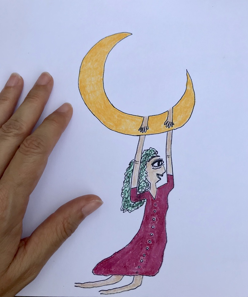5. Conversando con la luna… le doy las gracias, ambas nos vemos a los ojos, en silencio, no hace falta hablar, trato de sostenerla en mis manos para luego dejarla volar a su órbita. Ilustración de julio de 20216.