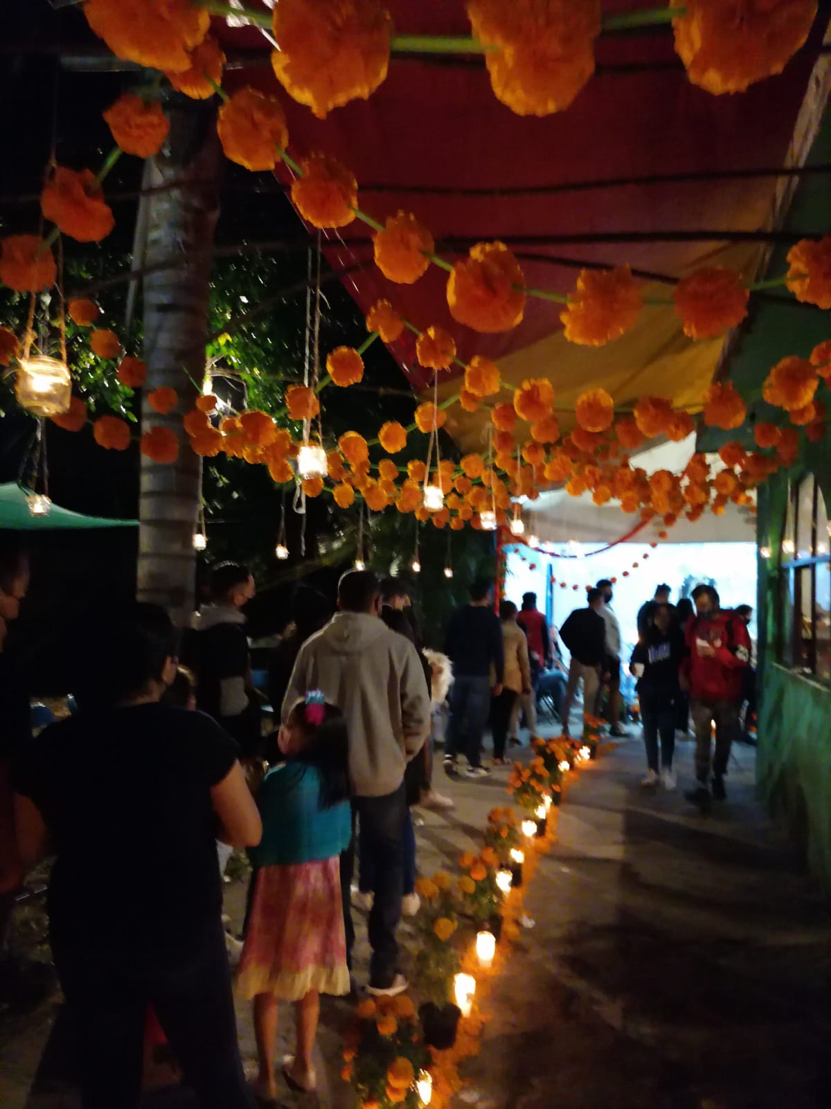 Ocotepec se viste de hospitalidad, cariño y celebración. Se escuchan a unas calles de distancia distintos grupos de música que hacen lo propio para entrar en calor en una noche que, parece, será fría. Recorro sus calles empedradas donde árboles frondosos de guayaba, vainas, nísperos, aguacates y flores como el tulipán, floripondio, el anís, buganvilla desparraman su belleza decorando algunas casas, habitadas por familias grandes e históricamente resistentes a ocupaciones de empresas depredadoras de lo local dentro del pueblo, para recibir las festividades de Día de Muertos como ha sido la costumbre, durante décadas.
