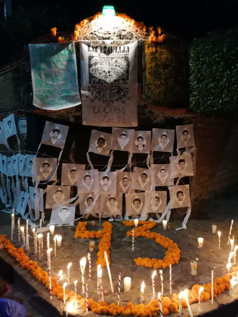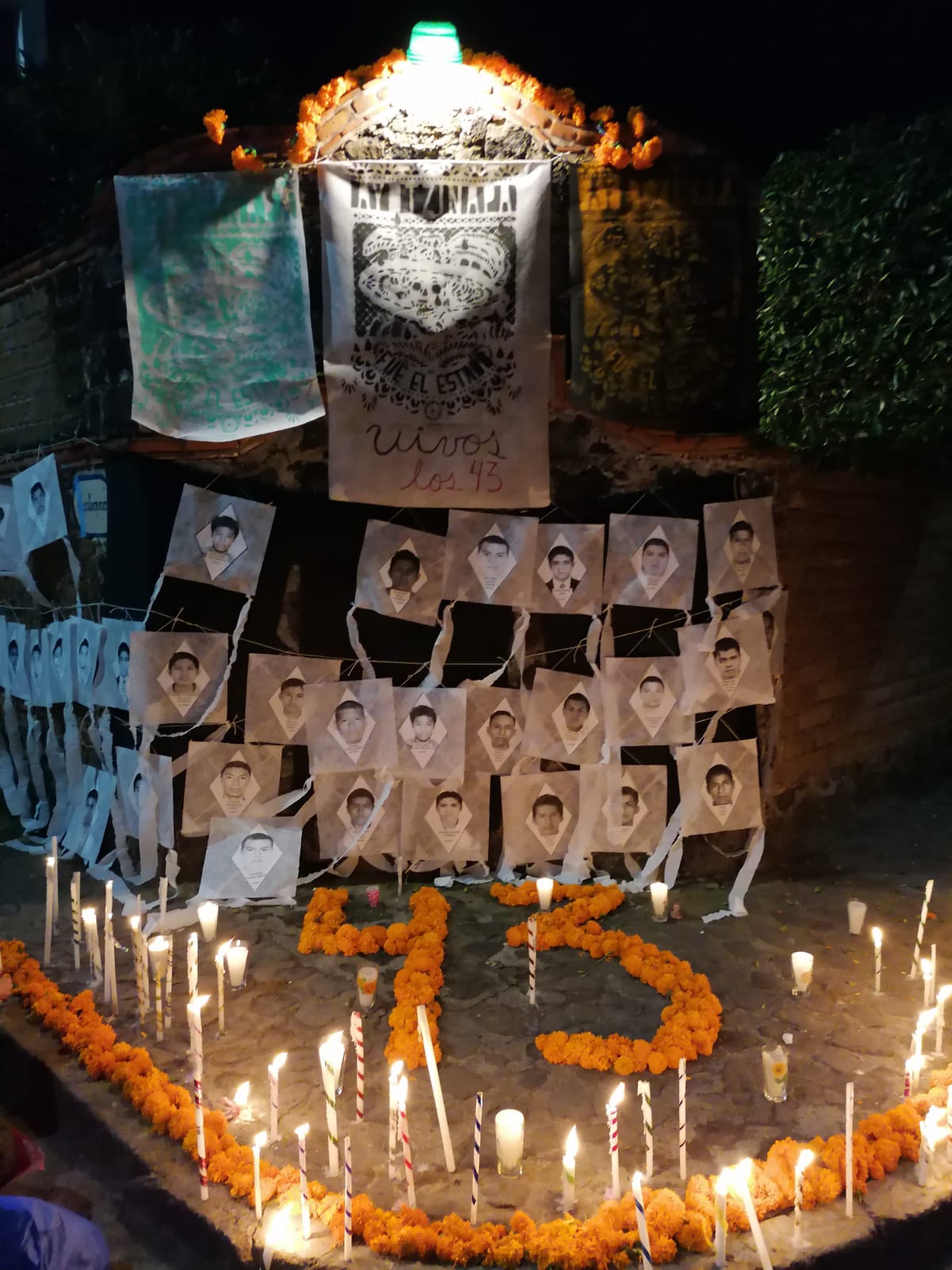 El bucle de la memoria los aprisionaba por igual, en su búsqueda de recuerdos sensatos de lo ocurrido, en una búsqueda de palabras que parecía eterna en sus rostros insólitos, como recién sumergidos en una tina con hielos. Pareció no existir, esa noche, capacidad de respuesta de los adultos en aquella esquina, llena de fotografías en blanco y negro colocadas en la pared empedrada con acabado de adobe, pegadas en soporte de pellón blanco cada una, un tapete de papel crepé con una silueta de catrina color blanco que decía en la parte inferior «Vivos los 43», iluminados por la luna y por ceras prendidas iluminando la escena que, en el centro, contenía lúcidamente los números cuatro y tres pintados consecutivos con flores de cempasúchil. Esa imagen sin respuesta fue la única explicación de lo sucedido a curiosos insaciables de respuestas lógicas a los acontecimientos plagados de todo lo inhumano, menos de claridad.