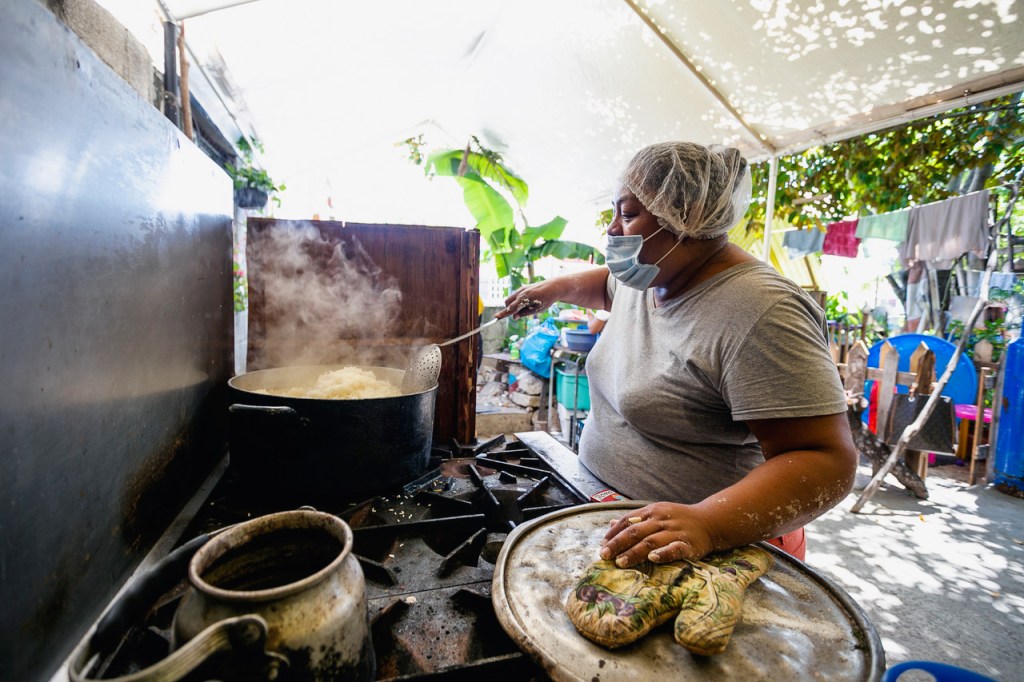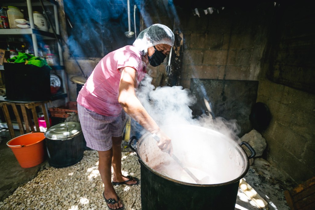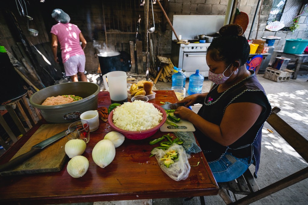 Las actividades comienzan a las 09:00, a veces un día antes dependiendo del platillo a preparar. “Hemos llegado a alimentar hasta 270 familias, con promedio de cinco personas por familia”, dice Sandy. “Comenzó como ayuda a nuestros vecinos, la mayoría se quedaron sin trabajo pues se dedicaban al turismo. Hacíamos comida para nuestra familia, y lo que nos quedaba mi mamá lo compartía con ellos. Mi hermana Brenda buscó la manera de hacerlo crecer y ahora alimentamos a cualquier persona que lo necesite sin importar de qué colonia sea.”